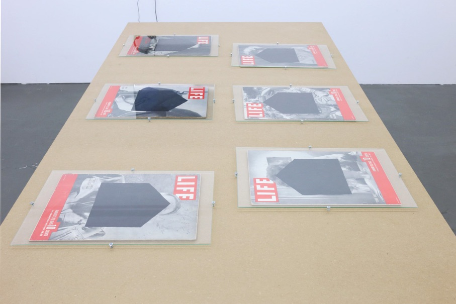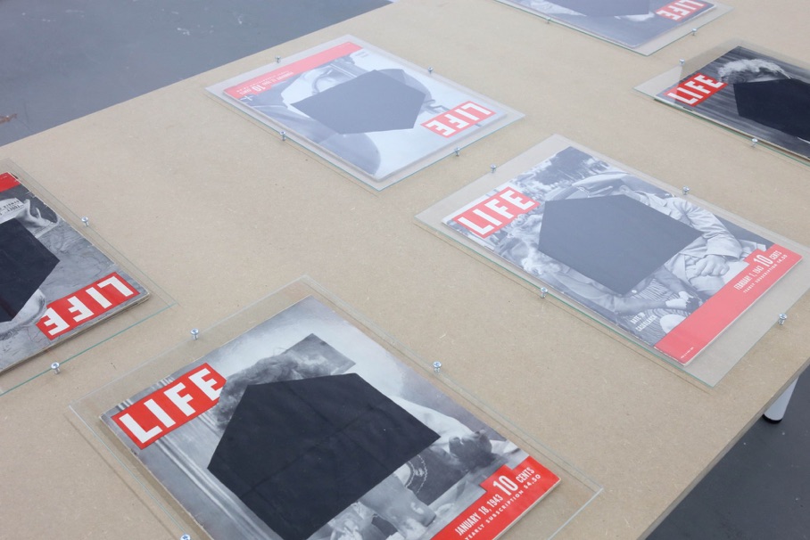 この作品は太平洋戦争中の日系人強制収容所が存在していた時期に発刊されていたライフ 紙の表紙の上に、私が日系人収容所のシルエットを描いた作品です。