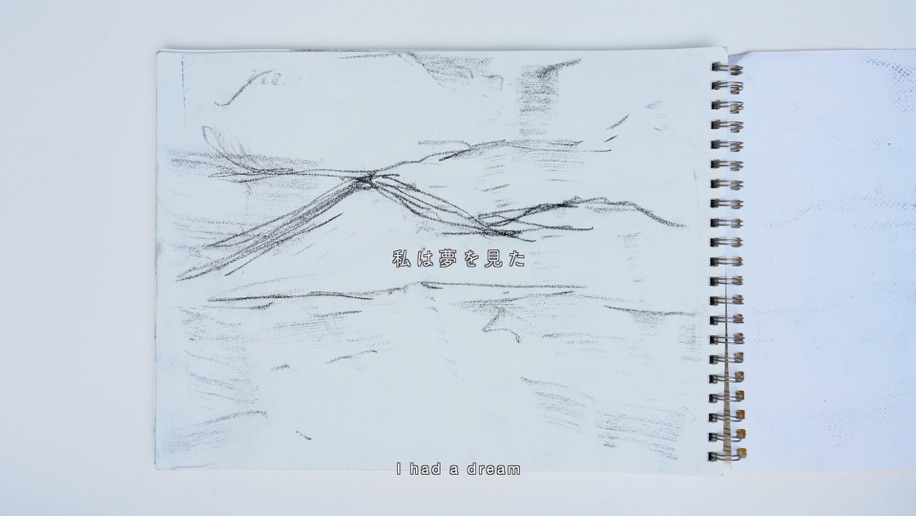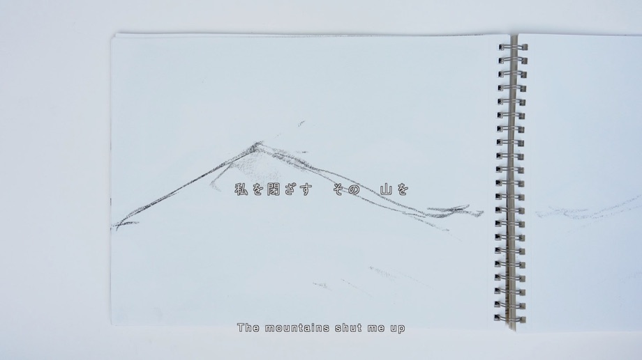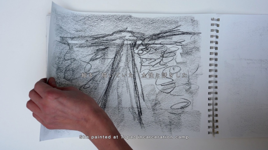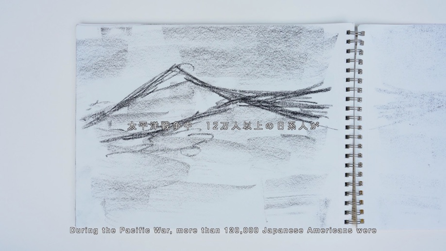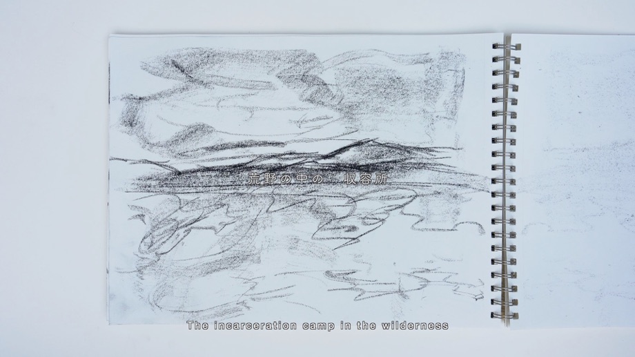 アメリカの日系人強制収容所では、日系人アーティストが指導する美術教室が存在し、多くの日系人が風景画などを描くことが許可されていました。この映像作品では、私の曾祖父が収容されていたトパーズ収容所の跡地で、私が描いた山のドローイングを基に「収容とアート」をテーマに、戦争やアートの検閲に言及した自身の詩を用いて制作しました。